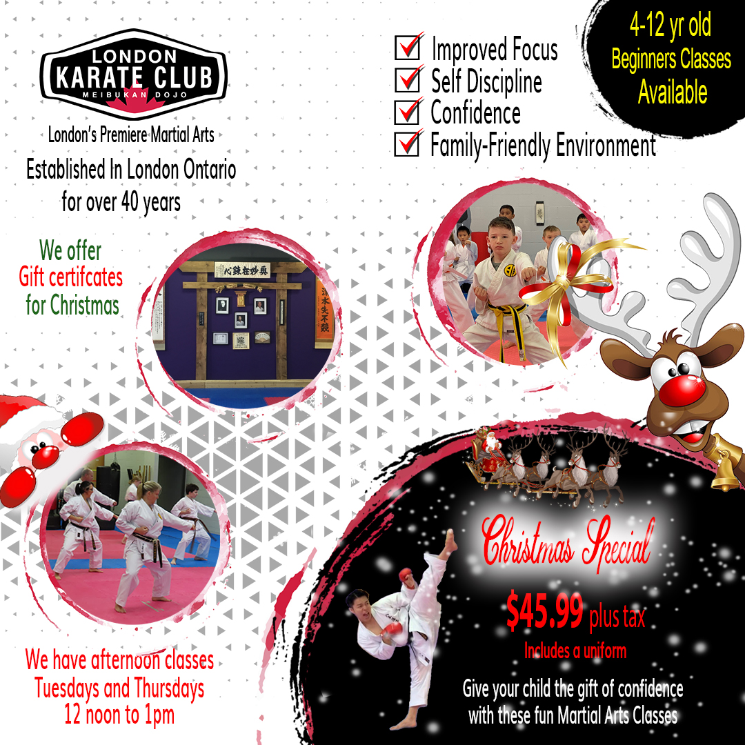 Christmas Special! We offer a 4 Week Beginner Program, 2 classes a week for 4 weeks and includes a uniform. For more information you can email us at info@londonkarateclub.com or call us at 519-777-1837
